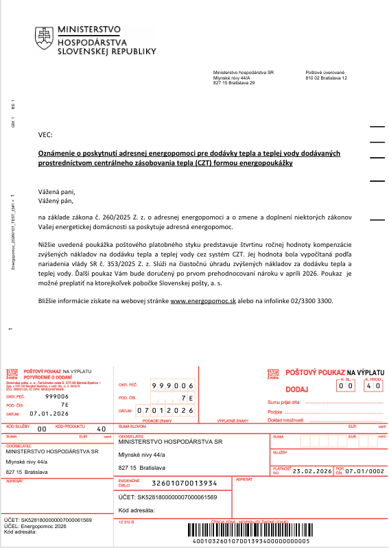 Ministerstvo hospodárstva (MH) SR v spolupráci so Slovenskou poštou, a. s. spúšťa proces generovania a distribúcie energopoukážok na čiastočnú úhradu zvýšených cien tepla a teplej vody dodávaných prostredníctvom centrálneho zásobovania tepla (CZT) pre vybrané skupiny domácností. Ide o súčasť adresnej energopomoci, ktorej cieľom je zmierniť dopady rastúcich cien energií. Kompenzácie zvýšených cien za elektrinu a plyn budú pre domácnosti - ktorým vznikol nárok na energopomoc - automaticky zohľadnené v zálohových platbách od dodávateľov.
